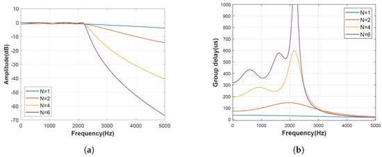 For the first, second, third, and fourth orders of Chebyshev-I-type filters, assuming that the high sampling rate is 40 kHz and the cut-off frequency of the passband is 2200 Hz, we can derive the amplitude response and group delay curves, as shown in Figure 3.