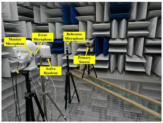 A laboratory experimental system was set up in an anechoic chamber whose inside space had dimensions of 6.54 m × 4.84 m × 4.74 m. The free-field radius of the anechoic chamber was 1.1 m, and the background noise was 12.1 dBA, as shown in Figure 4. In the anechoic chamber, a loudspeaker serving as the primary sound source, a reference microphone, an error microphone, a monitoring microphone, and an active headrest were arranged. Figure 5 shows a flowchart of the experimental system. The embedded real-time processor for ANC was mainly composed of an XC7K325T FPGA produced by the Xilinx Company (San Jose, CA, USA) and a TMS320C6678 digital signal processor (DSP) produced by the TI company (Dallas, TX, USA). The FPGA was responsible for data acquisition and interface management, while the DSP performed algorithm calculations. The core processor of the embedded real-time processor for monitoring was an XC7Z020 system on chip (SOC). The type of analog-to-digital converter (ADC) used was AD7606B, and the digital-to-analog converter (DAC) used was LTC2755-16; the quantization bits of both the ADC and DAC chips were 16 bits. The conditioning circuits provided a constant current source of 4 mA for the microphones, the type of microphones was YG-201, and the type of speaker was Swan-B4N. The power amplifiers used were CA8000C models produced by Harman (Stamford, CT, USA), and the DSP debugger was TL-XDS560V2.