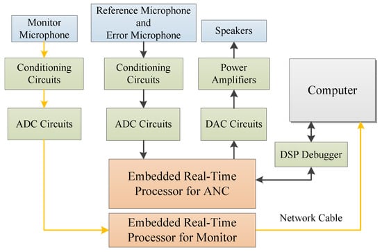All of the ANC signal-processing tasks were implemented with embedded real-time processors, and the computer was only used to control the working status of the DSP and to receive the network data from the monitoring microphone. The monitoring microphone, which was in close proximity to the error microphone, was only used to monitor the effect of noise reduction and did not participate in the control process. The embedded real-time processor for monitoring received the monitored microphone data from the ADC and then sent data to the computer through a network cable. In the experimental process, the high sampling rate was set to 40 kHz, and the low sampling rate was set to 5 kHz.
