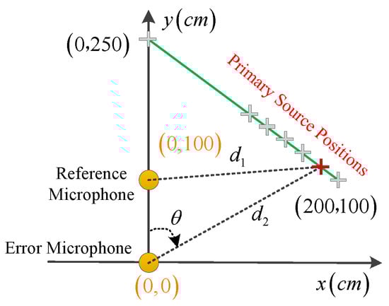 This experiment aimed to test the effect of the proposed method in improving the noise reduction performance by changing the direction of incoming waves from primary sound sources with different spectral structures. For convenience when comparing the noise reduction performance of the proposed method and other methods, the primary sound source was arranged at multiple test locations during the experiment, and the top view of the experimental system’s layout is shown in Figure 6.