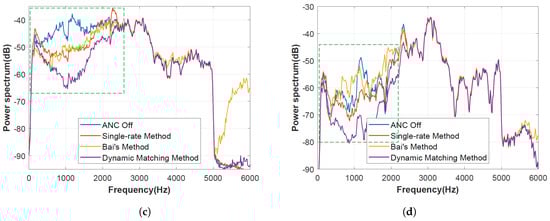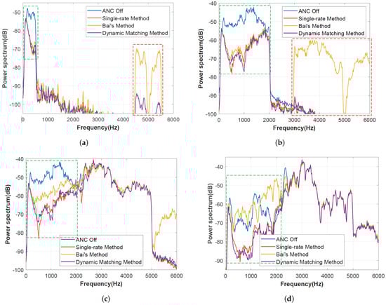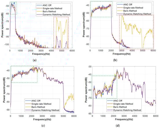 With a further decrease in , the noise reduction effect of the single-rate method began to increase regardless of the spectra of the primary sound source. When the primary sound source was located at point (0, 250), the noise reduction effects of different methods for different types of primary sound sources were determined, as shown in Figure 9. In this case, the three methods achieved good noise reduction effects in the low-frequency parts shown in Figure 9a,b, while the result given by Bai’s method still suffered from severe mirror noise. As shown in Figure 9c, the noise reduction effect of Bai’s method on the primary sound source did not continue to increase with the decrease in , and, as shown in Figure 9d, it still brought a serious noise uplift, as shown in the results.