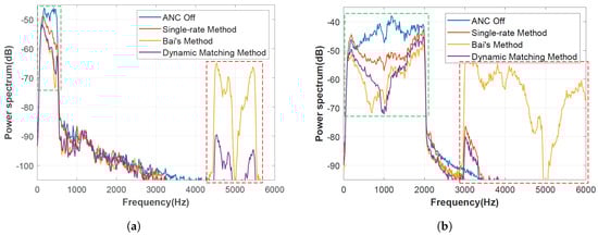 For “type c” and “type d” primary noise, there were components above half of the sampling rate, but the ratios of components above and below the sampling rate were different. The aliasing noise is an important factor in ANC systems. The ANR values of Bai’s method decreased by more than 5 dB in comparison with that of “type b” in positions (112, 166) and (0, 250). The proposed method had better anti-aliasing noise reduction properties than those of Bai’s method as the ANR values at position (0, 250) were at least 6.5 dB better. At the same time, the proposed method had better space robustness than that of the single-rate method as the ANR values in position (112, 166) were better than 6.7 dB and 8.5 dB, respectively, meaning that the group delay was better compromised with the aliasing noise cancellation.