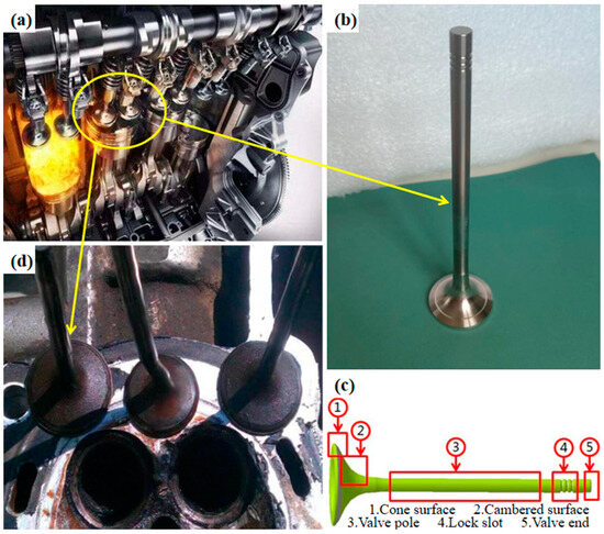 Valves are crucial components in engines, designed to open and close in a timely manner through the valve mechanism, thus ensuring the control of exhaust emissions in the cylinder [1]. However, due to the large amount of heat released by the combustion of fuel in a thermal engine, this heat cannot be quickly transferred outward, exposing valves to high-temperature conditions exceeding 600 °C. During the operation of the valve, reciprocating collisions between the cone surface and the valve seat occur. These significant impact forces result in severe wear of the cone surface, thereby reducing the service life of the valve [2,3]. The service condition, macroscopic structure, and impact wear failure of a valve are shown in Figure 1.