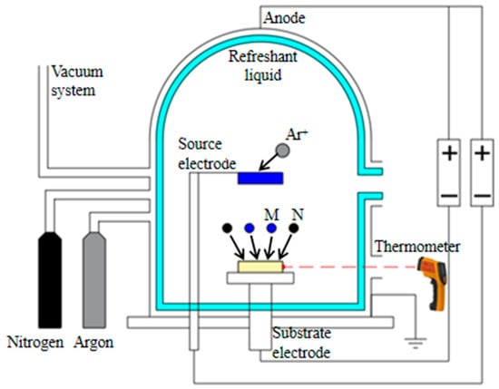 The preparation of the CrN coating involved the following steps. First, the mechanical pump was switched on to reduce the pressure to 0.1 Pa. Then, a pure argon gas was fed at a flow rate of 100 sccm, and the air pressure was stabilized at 32 Pa by adjusting the pumping rate of the mechanical pump. After that, a pulse negative bias of −800 V and −500 V was applied between the Cr target (source) and the substrate sample (cathode) with the anode, respectively, at a pulse frequency of 40 kHz. The source current was stabilized within 1.25 A by regulating the duty cycle of the bipolar power supply. The cathodic current was kept stable within 2.25 A. The electronic infrared thermometer was afterward used to monitor the furnace temperature. Once the furnace temperature reached 500 °C, argon and nitrogen gases were introduced at flow rates of 70 sccm and 30 sccm, respectively, by tuning the bipolar pulse voltage. The source current was stabilized within 1 A by adjusting the bipolar pulse voltage, and the cathode current was maintained at 1.6 A for 3 h after the nitrogen was supplied.