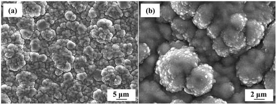 The surface microscopic morphology of the CrN coating is shown in Figure 5. The cell bulge structure on the surface indicates that the coating has grown in an island manner. According to Figure 5a, the coating grew evenly without cracks, pores, or any other defects. The initial cell particle diameter ranges from 1 to 5 μm and is evenly distributed on the surface of the sample, contributing to the fine crystal reinforcement effect. As shown in Figure 5b, after nucleation on the surface of the coating, the core surface grew through the atomic diffusion, forming a cell tissue with smaller particles and incorporating the new precipitation phase as the core.