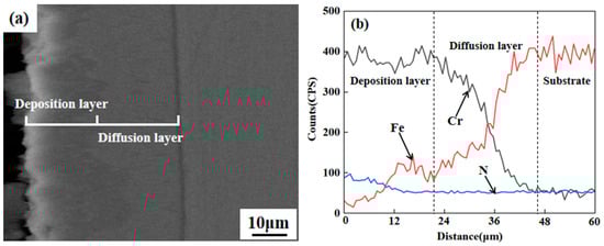The cross-sectional microscopic morphology and composition distributions of the CrN coating are shown in Figure 6. As can be seen from Figure 6a, the coating possesses a smooth and dense structure with a thickness of about 46 mm, without cracks or hole defects. It can be divided into deposition and diffusion layers from the outside to the inside. The outer surface of the deposition layer shows fluctuations within 1 μm due to the cell bulge structure. There are signs of layered accumulation and growth from the middle position of the deposition layer to the outer surface. A component transition exists between the diffusion and deposition layers, where the lattice distortion is significant because of the boundary phenomenon. Based on its location, the boundary has an irregular wave shape, and the thickness of the deposition layer is approximately 21 μm. The boundary between the diffusion layer and the substrate is uniform, forming a high-strength metallurgical bond, which effectively improves the service stability of the valve under high-temperature conditions [21]. As shown in Figure 6b, the diffraction intensity of chromium in the deposition layer fluctuates normally, while that of nitrogen gradually decreases from 100 CPS, indicating that chromium atoms were evenly deposited on the coating, while the diffusion of nitrogen atoms into the coating gradually decreased. In the diffusion layer, the diffraction intensity of chromium decreases, while that of iron shows a gradual increase, creating a transition layer between the deposition layer and the substrate. The integration of the CrN coating with the valve substrate through metallurgical methods reduces the thermal expansion coefficient difference and the degree of lattice distortion, thereby preventing large-amplitude cracking under high-temperature conditions.