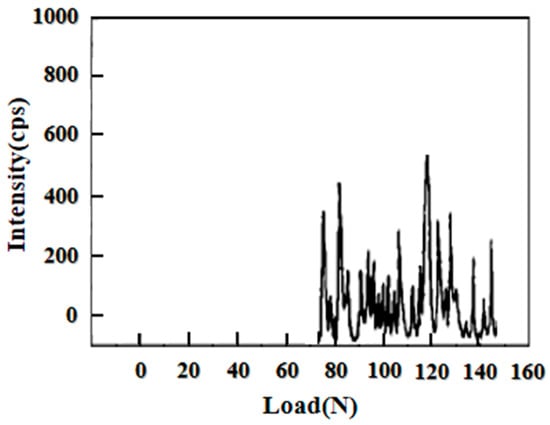 The adhesion test results are presented in Figure 7. At the initial stage of testing, the scratch depth was shallow, and the indenter slid smoothly on the coating surface without generating any acoustic signals. Once the load increased to 72 N, the coating underwent local rupture, and acoustic signals were generated, indicating that the Lc value of the coating was approximately 72 N. With a further increase in the load, the acoustic signals fluctuated continuously in the form of peaks, demonstrating the constant cracking and peeling off of the CrN coating.