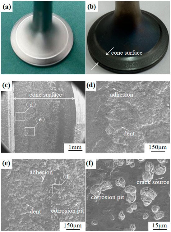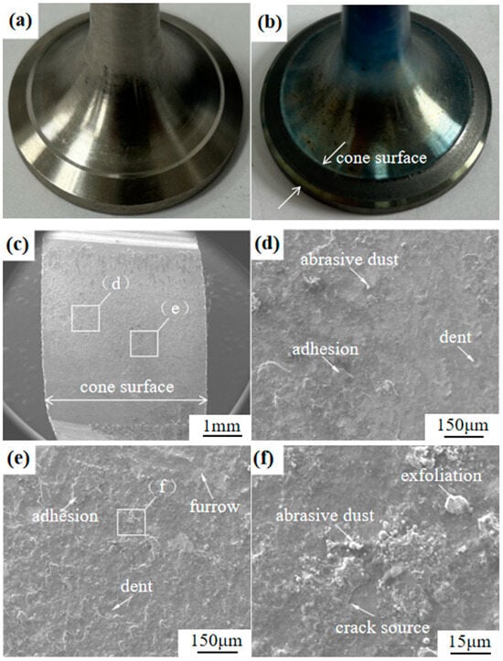 The macroscopic morphology of the valve substrate before and after wear is shown in Figure 8a,b, and its microscopic morphology is depicted in Figure 8c–f. Initially, the valve surface exhibits a metallic luster after machining, characterized by minimal roughness and a conical area mirroring a polished surface. Following the impact wear, the valve loses its original luster whereby the neck turns dark blue and the conical surface becomes black brown. This alteration occurs due to the high-temperature oxidation throughout the testing, altering the material’s structure and composition [23]. Figure 8c displays the flat wear surface of the substrate, with significant adhesion in the area near the neck of the substrate. Figure 8d–f reveal extensive grinding and adhesion on the surface alongside furrows and cracks. These phenomena result from the repeated high-load impacts inducing internal defects and microcracks. These cracks extend, connecting to the valve surface and leading to the material peel-off under the axial force, which causes adhesion between the valve and seat surfaces. After grinding, debris transform into hard particles at high temperatures, creating furrows on the surface of the substrate [24].