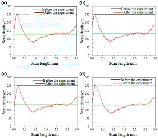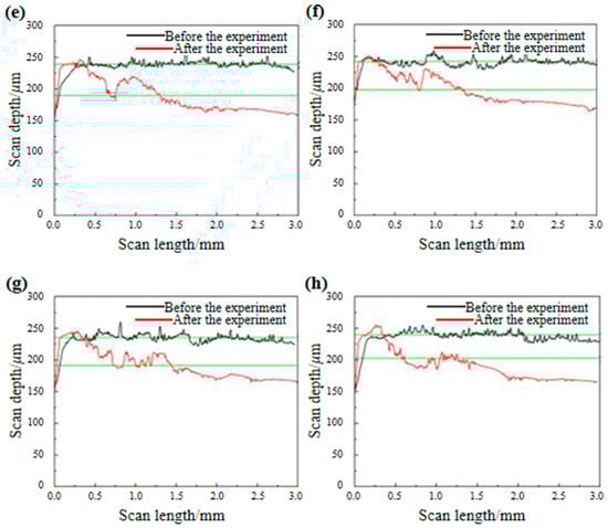 The wear surfaces of the valve substrate and CrN coating were scanned within a range of 0–270° at a step of 90° using a laser level. The contours of four wear surfaces were measured as depicted in Figure 10. Two horizontal lines denote the average depth of the contour before and after the test, with the difference representing the average wear depth. Figure 8a–d illustrate the valve profile before and after the contact between the valve base and its counterpart, while Figure 10e–h show the valve profile before and after the contact between the CrN coating and the seat pair. As can be seen from Figure 10, the contour curve before the test comprises two sections: a rapidly rising oblique contour and a horizontal contour. The horizontal contour corresponds to the cone area in contact with the seat, and the oblique contour is ascribed to the neck transition area of the valve, in which wear predominantly occurs. Initially, the horizontal contour of the valve substrate appears neat with minimal fluctuation, indicating low surface roughness; conversely, the horizontal contour of the CrN coating exhibits slight fluctuations, reflecting the microscopic surface morphology, which is consistent with the island growth regularity of the coating. During the test, the valve is subjected to the impact load from the spring and the burst pressure in the cylinder, leading to severe plastic deformation and radial flow. The acceleration of the circulating seat generates a shock load on the valve cone, causing periodic shear stress and contact stress, which leads to the wear and the notable increase in roughness of the valve surface. The wear depth of the valve substrate first increases and then gradually decreases, with the depth of the contour line significantly increasing after the test, which suggests a slow and stable deepening of the CrN wear depth of the coating below that of the valve substrate. This indicates the high hardness and good wear resistance of the coating [26].