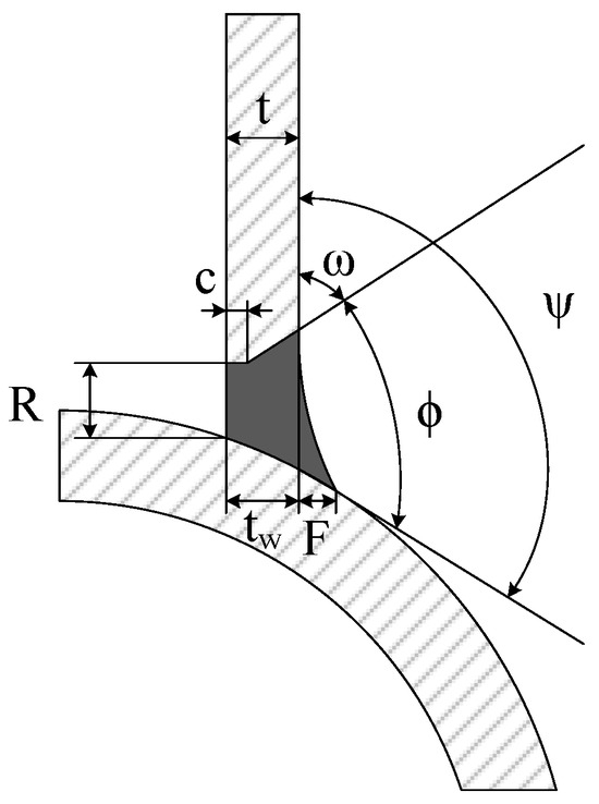 Accurate modelling of the weld geometry is important for the determination of the SCF [22]. In the present study, the weld geometry along the intersection between the chord and brace is assumed based on the specifications of the AWS [23]. The dihedral angle ψ is defined as the angle between the chord and brace surface, which varies along the intersection curve. For the T-shaped tubular joint, ψ varies from 90° at the crown to at the saddle [10]. The weld geometry specified by the AWS is closely related to ψ. Prequalified joint dimensions and groove angle for the tubular T joint are shown in Table 1. The joint details are shown in Figure 2. According to the requirements shown in Table 1, the following joint dimensions are assumed: ω = 45°, R = 2 mm, c = 0 mm, F = t/2, and tw = t. The joint included angle is the difference between ψ and ω, which satisfies the requirement. The weld leg size can be less than t/2 for ψ > 90°. A conservative assumption that F has a constant value equal to t/2 along the intersection curve is adopted to simplify the modelling.