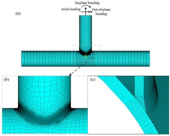 The FE analyses are performed using ANSYS Mechanical APDL 2020 R2 [24]. The element type SOLID186 is used. The mesh condition is shown in Figure 3. The FE model is divided into several zones. Coarse mesh is used in the zone away from the weld, and in the zone including the weld, dense mesh is employed. A mesh convergent study is conducted to justify the mesh condition. The number of elements for the thickness of the chord and brace is 6, where 648 elements are used along the intersection curve of the weld toe. The approximate mesh size around the weld toe is 2 mm. Young’s modulus and Poisson’s ratio are 206 GPa and 0.3, respectively. Both chord ends are fixed, and the three load cases acting on the brace are considered, namely axial loading, in-plane bending and out-of-plane bending.