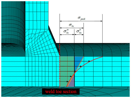 The stress distribution along the weld toe section can be separated into three components, namely the membrane stress, bending stress and nonlinear stress [26]. The peak stress at the weld toe is the summation of the three components. The hot-spot stress is the summation of the membrane stress and the bending stress , as shown in Figure 4.