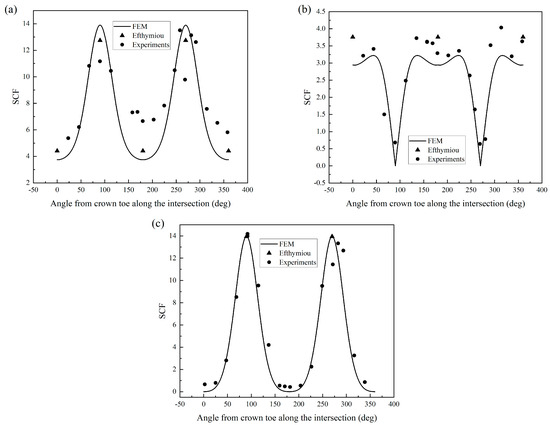To validate the FE analysis method, the obtained SCF results are compared with the experimental results provided by Yeoh et al. [27] and Soh [28] and the results of Efthymiou equations [8], as shown in Figure 5. Although the experimental method is based on the surface stress extrapolation method, the results obtained by FE analyses using the through-thickness linearization method are consistent with the experimental results. The shape of the SCF distribution from the experimental measurement is well captured. In the case of axial loading and IPB, there are some differences at the crown, which is reasonable, because the strain gauge failed to provide accurate information about the position of the weld toe and weld geometry in the experiment, and some measurement inaccuracies have been reported [27]. Compared with Efthymiou equations, the SCF calculated by the FE method at the saddle is underestimated under axial loading and IPB, while the SCF of the crown is slightly overestimated. This error may be due to the modelling of the weld geometry in the FE method, which is not considered in the development of the Efthymiou equations.