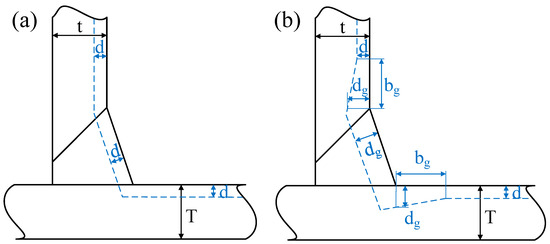The uniform corrosion and grooving corrosion are modelled as shown in Figure 6. The outer surface of the tubular joint is uniformly removed due to uniform corrosion whose corrosion depth is d. The modelling of grooving corrosion is mainly based on the work of Tanaka et al. [30]. It is assumed that the weld metal and base metal are both subjected to uniform corrosion, but their corrosion rates are different; the corrosion rate of weld metal is 1.4 times that of the base metal, i.e., the corrosion depth of the weld metal dg equals 1.4 d. The above assumptions are consistent with the observations in [30]. The corrosion degradation rate of the heat-affected zone is assumed to be linearly varied from the weld metal to the base metal, and the width of the heat-affected zone bg is assumed to be 3 mm. It has been shown that plastic deformation is the main reason for stress corrosion [30]. Because plastic deformation is limited in practice, the contribution of stress corrosion to grooving corrosion is ignored. The reference points for the determination of the hot-spot stress are placed concerning the new weld toe and plate thickness due to corrosion. The FE models of uniform and grooving corrosion are shown in Figure 7.