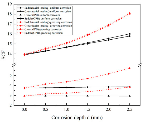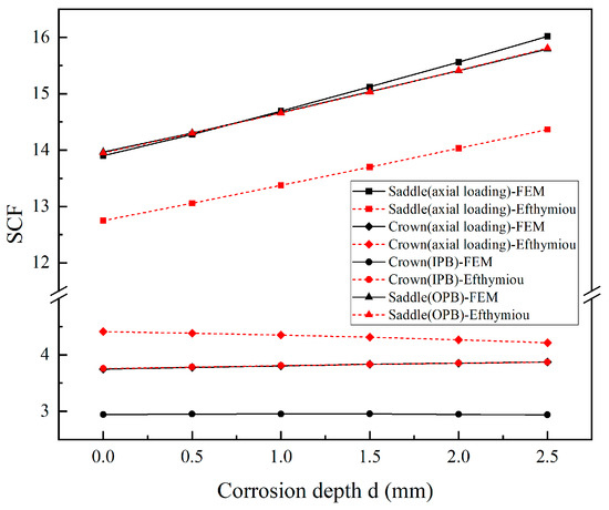 The effect of uniform corrosion degradation on the SCFs is shown in Figure 10. The corrosion depth d ranges from 0 to 2.5 mm. Using a corrosion rate of 0.1 mm/year [30] and a service life of 25 years, the maximum uniform corrosion depth is 2.5 mm. Figure 10 shows the variation of the SCFs at the critical points as a function of the uniform corrosion depth. The SCFs are calculated using the FE method and the Efthymiou equations, respectively.
