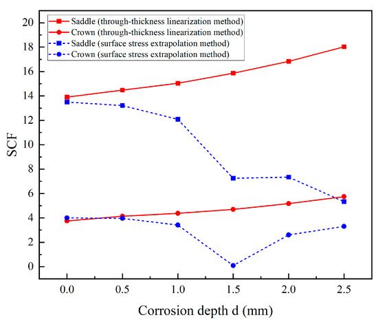 For the grooving corroded tubular joint, the results of the surface stress extrapolation method are compared with those of the through-thickness linearization method for the axial loading condition. The SCFs as a function of d are shown in Figure 11. The trends of SCFs are different. The SCFs obtained by the surface stress extrapolation method decrease with d, and the decrease is not continuous, while the SCFs obtained by the through-thickness linearization method continuously increase with d. The difference in the SCF between the two methods becomes significant when d varies from 0 to 2.5 mm.