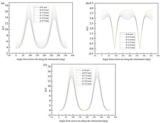 SCFs of the weld toe on the chord for grooving corrosion under (a) axial loading; (b) in-plane bending; and (c) out-of-plane bending.