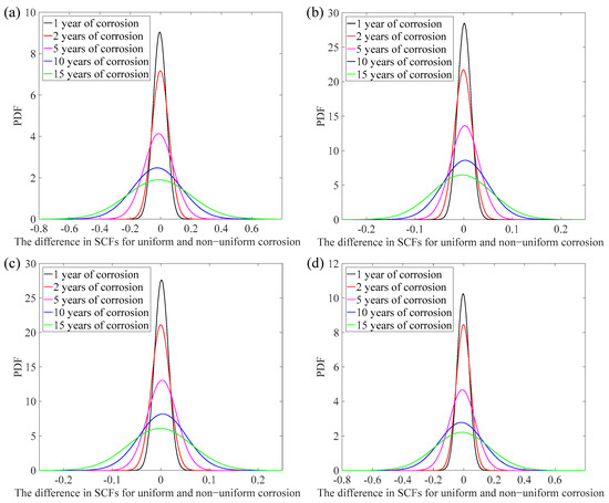 PDF of the SCF deviation between uniform and non-uniform corrosion: (a) saddle region under axial loading; (b) crown region under axial loading; (c) crown region under IPB; (d) saddle region under OPB.