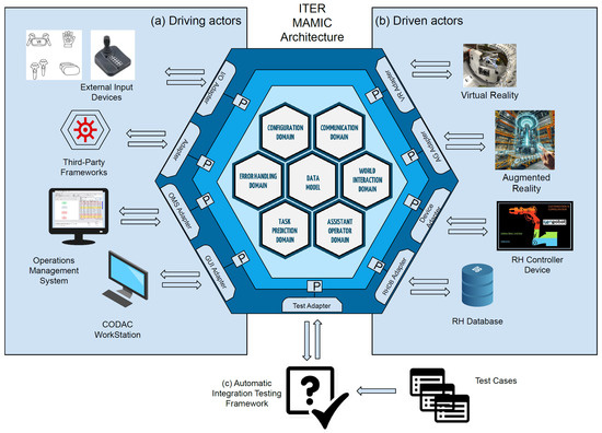 The driving agents (primary) are those that initiate the interaction: the external input controller transfers data to the application through a port, the RH task operations in structure language process it in an automatic or semi-automatic way, and third-party frameworks send the data through the adapter to carry out some actions. The driven agents (secondary) are those that respond to the application’s request: a database adapter is called upon by the application to retrieve the data, an RH controller device is commanded by the application layer and also publishes status information through the port, and mixed reality is presented to visualize the in-vessel critical environment.