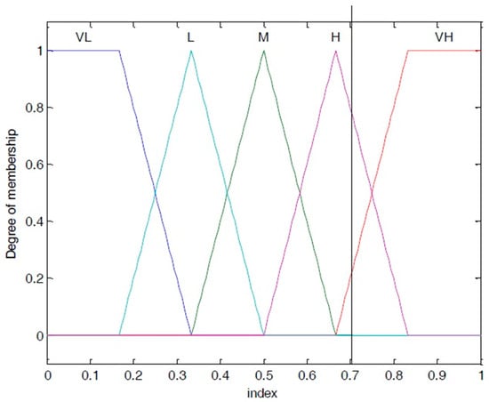 This fuzzy number is expressed using three triangular-central membership functions and two trapezoidal functions at the domain’s boundaries. The membership functions are symmetrical with respect to the value 0.5 [53]. This value indicates the degree to which each variable belongs to various fuzzy sets when its membership degree changes.
