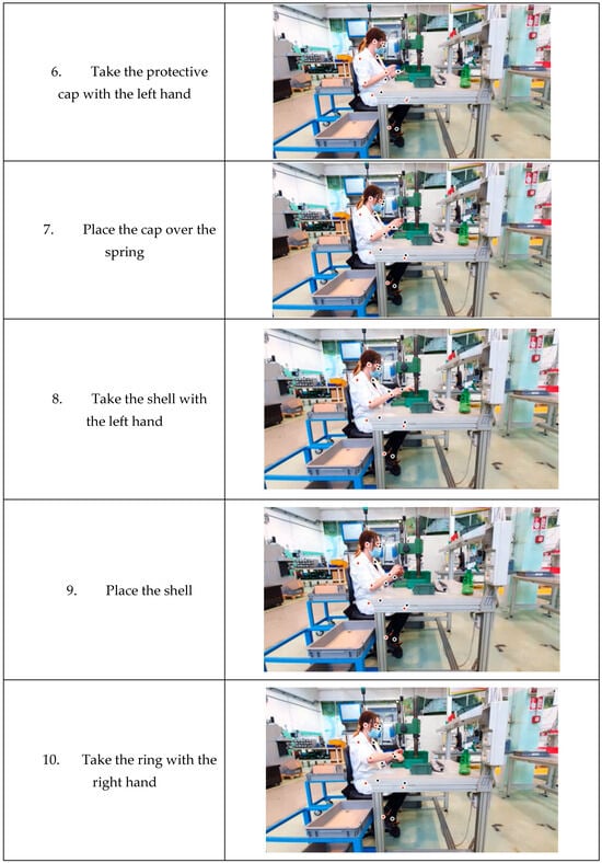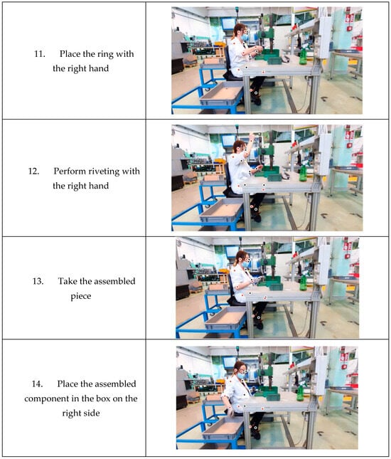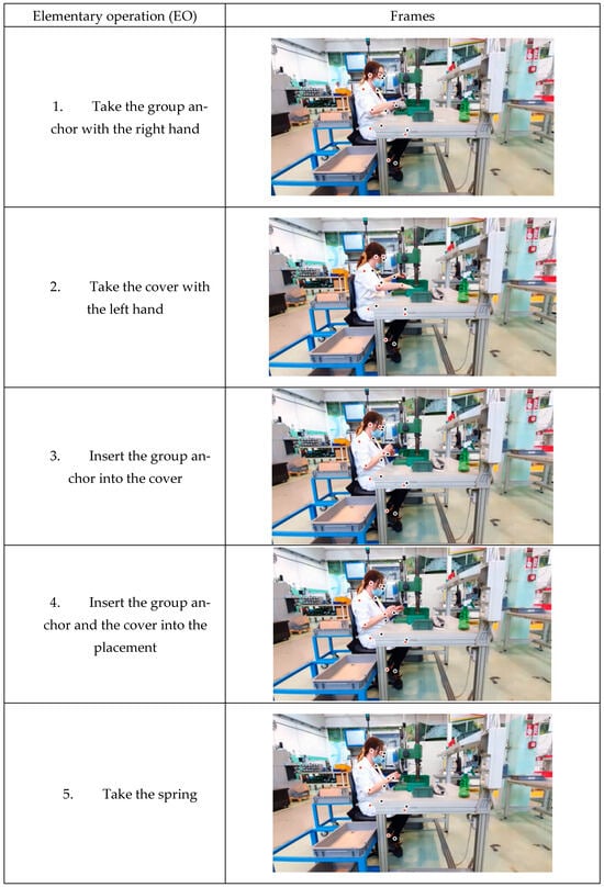 The entire assembly process is described in Figure 5, where the frames of the EOis of the worker are shown. In the first step, the analysis focuses on the set-up activity. This activity is divided into fourteen EOs. This section of the study provides an accurate ergonomic assessment method by introducing posture estimation algorithms based on bi-dimensional (2D) video. To monitor the postures of the employees, we developed an ergonomic evaluation algorithm able to provide the values of the joint angles as an output.
