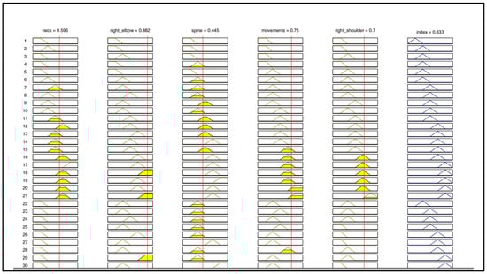 In this study, the fuzzy engine (FE) is implemented using the Fuzzy Logic Toolbox in MatlaR2023b. The FE processes five variables, which are outlined in [40] and Table 2. These variables define the measure of postural stress for the upper quadrant, in particular, for the elbow, shoulder, neck and trunk, while another index refers to high repetition of the same movements.