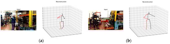 The same ergonomic parameters were used as the input, and the frames of the EOis chosen within our research methodology were inserted. As the output, the system returned the human pose in 3D, as shown in Figure 10a,b.