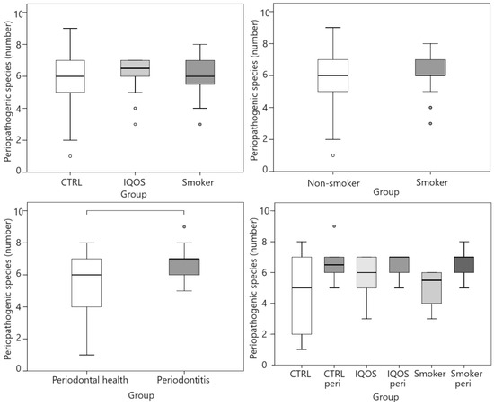 Number of perio-pathogenic species in groups formed according to tobacco exposure, presence of periodontal disease, and combination. Boxes represent interquartile ranges, horizontal lines represent medians, whiskers represent minimum and maximum values, and circles represent outliers. A horizontal line connects groups that differ significantly.