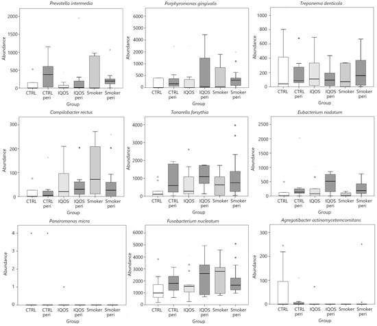 When groups with tobacco exposure and the presence of periodontitis were compared, P. intermedia showed the highest abundance in the group of non-smokers with periodontitis (CTRL peri), while P. gingivalis and T. denticola were most dominant in cigarette smokers with periodontal disease (Smoker peri). T. forsythia and E. nodatum expressed the highest levels in the IQOS group with periodontitis (IQOS peri); see Figure 2.