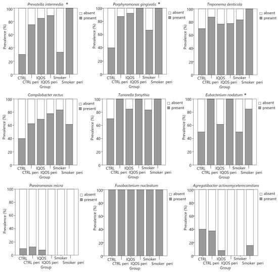 Prevalence of perio-pathogenic species according to tobacco exposure and presence of periodontitis. Asterisks denote bacteria whose prevalence significantly differed between groups.