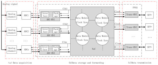 In NoC-based data acquisition, ADCs are mapped to the nodes on the network resources [17], while the router clock is used as the ADC sampling clock. Under the control of the routers, TI-ADCs perform parallel data acquisition with a sampling rate fs and resolution of m bits. Thus, the total sampling rate is increased to n × fs, while the resolution remains m bits to achieve the effect of a high sampling rate. Firstly, the data pass through the analog front end and into the ADC. Secondly, under the control of the ADC resource network interface, the data are encapsulated and transmitted to the on-chip network. Thirdly, under the router’s forwarding, the data are transmitted to the destination node’s high-speed transmission resource network interface. Finally, the data are output through the optical port.