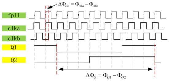 Since the frequency of is close to that of and , the two D flip-flops output the low-frequency signals Q1 and Q2, respectively. The phase difference between Q1 and Q2 is the amplified phase difference of the original signal. Therefore, the phase difference between and can be calculated through pulse shaping and counting, as shown in Figure 3.
