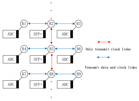 Network on-chip data acquisition topology. Each router connects to a resource node IP core. The left and right columns are data acquisition nodes, connected to ADC chips. The routers in the middle column are data transmission nodes, connected to high-speed transmission interface IP cores. The red links transmit clock synchronization messages, while the blue links are responsible for transmitting the collected data across the entire network. This topology is simple and easily scalable, allowing for the expansion of multiple ADC acquisition nodes and data collection nodes according to actual needs.