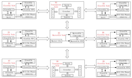 The sampling clock of the TI-ADC channel needs high-precision synchronization to ensure the performance of data acquisition. The White Rabbit protocol can realize sub-nanosecond-level synchronization, so it is applied to the NoC in this paper, and it is also improved to implement clock synchronization between routers. A 2D mesh topology of nine routing nodes is taken as the example to design the corresponding router clock synchronization scheme, as shown in Figure 6.