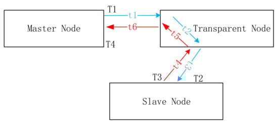 When solving the link delay and clock offset between the master and slave nodes, the message resident time of the forwarding node should be deducted, as shown in Figure 7. Therefore, the new link delay and clock offset between the master and slave nodes are shown in Equations (7) and (8) respectively.