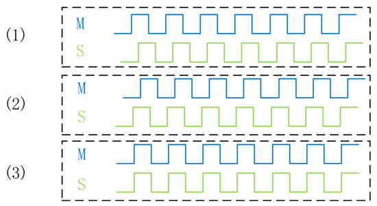 The phase relationship between master (M) and slave (S) clocks. The first scenario is that the phase of the master clock is in front of that of the slave clock. The second one is that the phase of the slave clock is in front, and the third one is that the master and slave clocks are in the same phase.