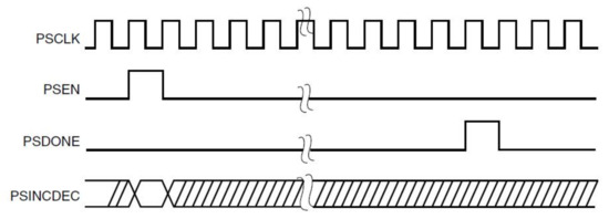 In addition, the dynamic phase shift of the module is controlled by psen, psincdec, psclk, and psdone. psen represents the enabling signal that controls the phase shift; psincdec represents a signal that controls an increasing or decreasing phase; psclk represents the driver clock used for phase-shift control signal; psdone represents the phase-shift completion marker signal. The clock output of the MMCM is dynamically increasing or decaying from the initial phase or the phase executed before. The psen, psincdec, psclk, and psdone signals are synchronized, and the signal timing is shown in Figure 12.
