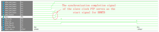 - We improve the PTP protocol to determine the offset of the master clock and slave clock and realize coarse synchronization of the master clock and slave clock. DDMTD is designed to determine the phase of the master–slave clock. According to the phase value of PLL IP in the Xilinx FPGA dynamic phase shift, the phases of the master clock and slave clock are corrected to achieve their precise synchronization.