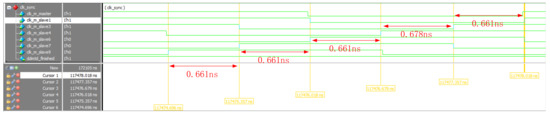 In the DELAY_REQ state, the request signal req_from_x (e/s/w/n) is received from four directions, and the response signal grant_to_x (e/s/w/n) is given back. Each delay_req message sent from the slave node is then received and the arrival time of delay_req message is recorded as T4_x (1/3/4/6/7/9) according to the address of the corresponding source node in the message. In addition, a node pulse signal T4_x_end is generated upon receipt of each delay_req message from the slave node, which is then encapsulated in the delay_resp message format as delay_resp_x (1/3/4/6/7/9). When the package is completed, it is sent to the slave node and the corresponding delay_resp_x_flag is raised until delay_req_end goes high. Then, the delay_resp_x_flag signal is changed to the low level, and the state machine returns to the IDLE state. So far, the master–slave node clock message interaction is completed.