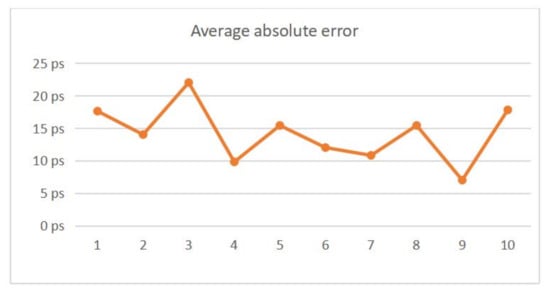 Next, by changing the initial phases of the master and slave clocks, the tests are repeated 10 times. The average absolute errors of the adjacent sampling interval after clock synchronization are shown in Figure 16.