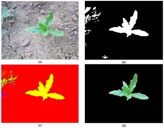 To remove pixel-level noise from the image, first, a 5 × 5 Gaussian filter was employed. Given that the RGB color space may not be optimal for emphasizing green areas, the images were converted to the HSV color space. In the HSV image, the green areas were isolated, and all other pixels were set to black. The green color was defined by a range in HSV color space: lower_green = (30, 40, 40) and upper_green = (80, 255, 255). This process created a black-and-white mask highlighting the green regions. Figure 2b shows the mask, and it contains many other parts that are related to different plants. Subsequently, clusters of connected pixels within this mask were identified. Each cluster has a different color, as shown in Figure 2c.