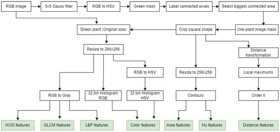 In this study, we extracted more distinct types of features from plant images to comprehensively characterize their visual properties. These included shape descriptors, distance transform-based measures, color histograms, and three types of texture features. The integration of these diverse feature sets aimed to provide a holistic representation of the plants’ morphological structures, spatial distributions, color compositions, and textural patterns. This multifaceted approach facilitated a robust analysis and interpretation of the visual information encoded within the images.