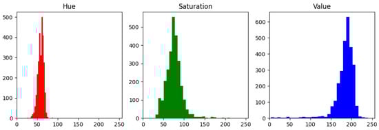 For the color-based features, color histograms were utilized. Initially, we analyzed the original RGB images, which were composed of three bands: red, green, and blue. Furthermore, we transformed the images into the HSV color space, where the three bands represented hue, saturation, and value. From these six channels, histograms comprising 32 bins each for the R, G, B, H, S, and V bands were constructed, yielding a total of 192 parameters. These histograms provided valuable insights into the distribution of colors within the images, thereby facilitating weed detection and classification efforts. The HSV channel histograms are displayed in Figure 6.