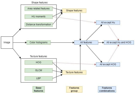 In the preceding sections, the foundational features extractable from an image were introduced. These features serve as the basis for classification tasks or deepening the understanding of their behavioral characteristics. With the three fundamental shape-based features at our disposal, feature combinations were constructed from these attributes. Similarly, three distinct types of texture combinations were explored, and texture-based feature combinations were assembled for testing purposes. The integration of all features was a pivotal step in the analysis. Subsequently, the least impactful texture and shape features were selectively removed to assess their individual contributions. The foundational features and their combinations are depicted in Figure 7.