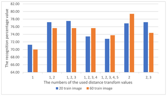 Some distance transformation parameter combinations to find the optimum features with 20 and 60 training images (1 is the largest value, 2 is the second largest, and so on).