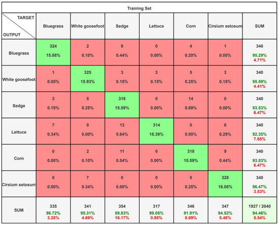 In [10], weed recognition was performed using local binary patterns (LBPs) to extract local texture features. The extracted features were classified using template matching and SVM. For LBPs, template matching achieved a classification rate of 83.3%, while SVM achieved a rate of 93.8%. The study included two types of weeds, thus conducting binary classification and using a limited set of 200 images for each class.
