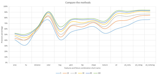 When all extracted features, excluding HOG features, were combined, the results improved significantly. Even in RF, we observed a precision result of 93.71% with 160 training images, while the GBM reached the maximum value of 94.56%. The results are presented in Table 15.