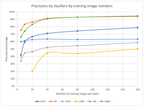 It is encouraging to observe that even with as few as 10 training images, an 84% precision classifier can be developed. With approximately 40 training images, a precision of 91% was achieved. For datasets containing around 160 training images per plant, precision results approaching 95% were attained. In our study, the maximum precision achieved was 94.56%.