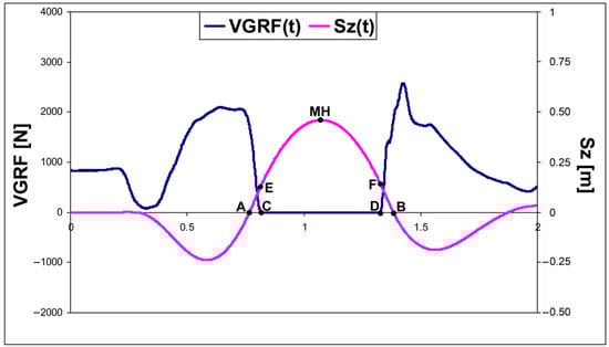 The VGRF(t) and sz(t) graphs for the representative trial of CMJ. VGRF—the vertical ground reaction force, sz—the vertical displacement of the jumper’s center of mass, CMJ—the counter movement jump, MH—the maximum height in the CMJ, A—the point for the sz = 0 during the take-off phase, B—the point for the sz = 0 during the landing phase, C—the starting point of the jumper’s flight phase, D—the ending point of the jumper’s flight time, E—the ending point of the take-off phase, F—the starting point of the landing phase.