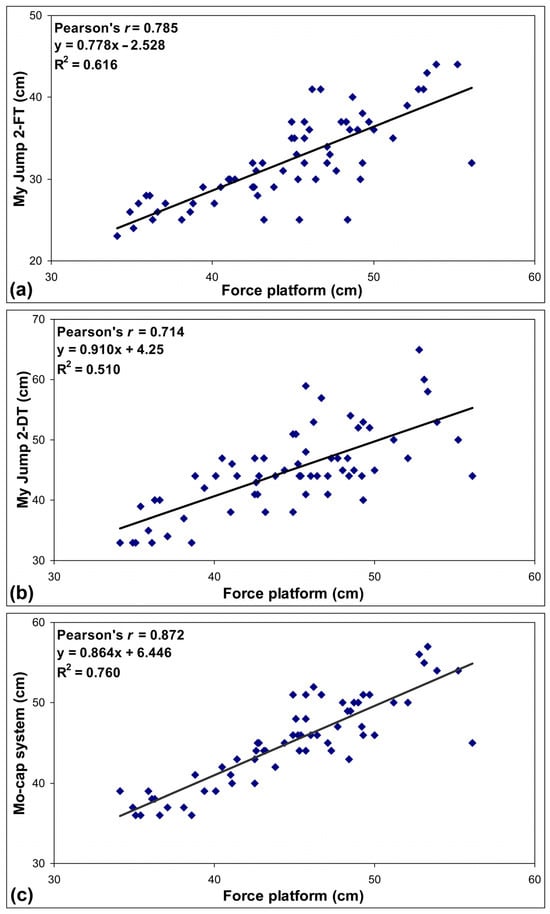 In addition, there was a very large correlation (0.7 < r < 0.9) between the My Jump 2-FT and force platform (p < 0.001) (Figure 4a), between the My Jump 2-DT and force platform (p < 0.001) (Figure 4b), and between the mo-cap system and force platform (p < 0.001) (Figure 4c).